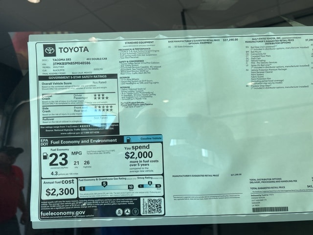 Factory MSRP: $42,207 $1,055 off MSRP! Tacoma SR5, 4D Double Cab, 2.4L 4-Cylinder, 8-Speed Automatic, RWD, Black, Boulder/Black w/Fabric Seat Trim or Fabric Seat Trim (FF), 3.583 Axle Ratio, 4-Wheel Disc Brakes, 6 Speakers, ABS brakes, Air Conditioning, Alloy wheels, AM/FM radio: SiriusXM, Anti-whiplash front head restraints, Apple CarPlay/Android Auto, Auto High-beam Headlights, Auto-dimming Rear-View mirror, Brake assist, Bumpers: body-color, Driver door bin, Dual front impact airbags, Dual front side impact airbags, Electronic Stability Control, Emergency communication system: Safety Connect (1-year trial), Exterior Parking Camera Rear, Fabric Seat Trim, Four wheel independent suspension, Front anti-roll bar, Front Bucket Seats, Front Center Armrest, Front fog lights, Front reading lights, Fully automatic headlights, Heated door mirrors, Illuminated entry, Knee airbag, Low tire pressure warning, Occupant sensing airbag, Outside temperature display, Overhead airbag, Overhead console, Panic alarm, Passenger door bin, Power door mirrors, Power steering, Power windows, Radio: 8" Toyota Audio Multimedia, Rear step bumper, Rear window defroster, Remote keyless entry, Speed control, Speed-sensing steering, Split folding rear seat, Steering wheel mounted audio controls, Tachometer, Telescoping steering wheel, Tilt steering wheel, Traction control, Trip computer, Variably intermittent wipers, Wheels: 17" Styled Alloy.